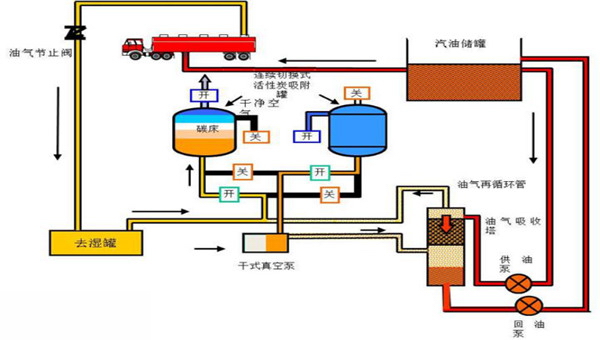 利用活性炭選擇性吸附,實(shí)現(xiàn)油氣和空氣的分離;钚蕴靠梢悦摳皆偕,采用干式真空泵抽真空的工藝,脫附出的油氣經(jīng)過(guò)吸收塔進(jìn)行回收。吸收塔所用吸收劑是儲(chǔ)罐區(qū)低標(biāo)號(hào)汽油或輕柴油,也可用煤油